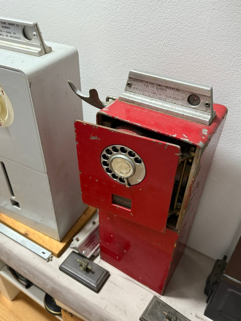 COIN TELEPHONE N0.2: These two basic types are known as Central Office and Melbourne Workshop models, and are very similar in concept. Less than one thousand were build in the early 1970’s and used around Melbourne. Two were installed in Sydney experimentally but were found unsatisfactory. The CT2 was a local call instrument only and was therefore probably obsolete when conceived, even as a complement to the CT1. The CT1 apart from design difficulties and problems associated with vandalism was only suitable for local calls or manually assisted trunk calls. The development of the CT3 by Telecom Australia takes advantage of new technology and innovations was designed for direct subscriber trunk dialing which automatic networks in Australia now provide.![]() Source- (with thanks to) History of the telephone in New South Wales / by Jim Bateman [Croydon, N.S.W.] : J. Bateman, 1980 ISBN: 0959478701 Below- prototype (red phone, middle image) |