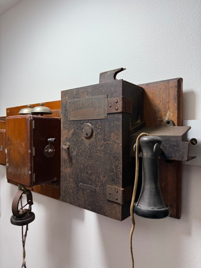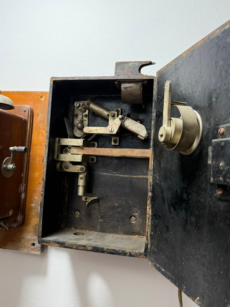 Above- L.M. Ericsson coin telephone. Note- I do not believe that this was used in Australia. It was probably brought from the UK. Made by L.M. Ericsson Sweden, ca 1900. Below- United Safe Toll Company coin box. c 1910