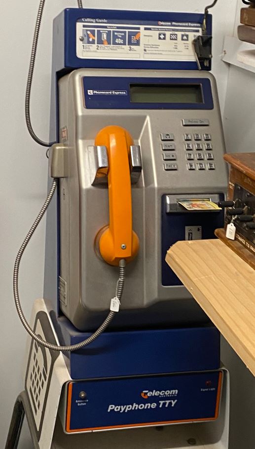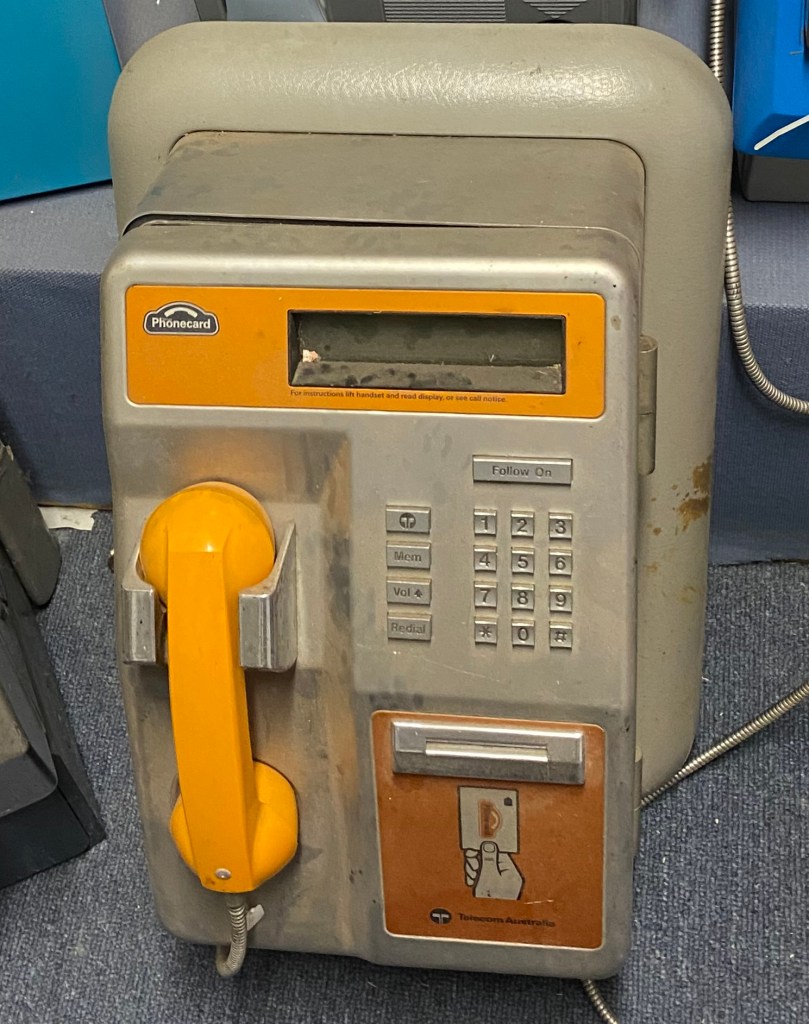 | CP-09 – Card-Only Phone The CP-09, closely resembling the Japanese Anritsu FX7003 IC Card Payphone, was one of the more advanced card-only public phones in the Telstra network. It accepted only Telstra-branded phonecards and included features such as volume control, redial, memory storage, and a follow-on call button—making it a versatile unit for the time. Internally, the phone contained vertically mounted circuit boards inserted into sockets at the rear. The card reader was housed in the same distinctive black plastic casing as found in the CT3c model. Beneath the reader, a small container collected the punched chads from inserted cards. If this container was removed, the phone automatically reported its absence via DPMS (Data Phone Management System), ensuring security and accountability. The CP-09 required a 21V AC power supply and was also available in a TTY-compatible variation for hearing-impaired users. These versions included a stainless steel drawer mounted below the unit, containing a keyboard for teletype functionality. They were commonly installed in major urban areas. |