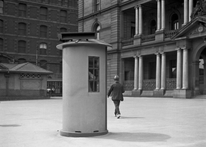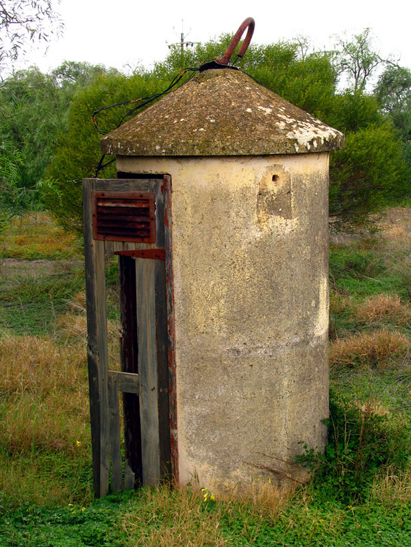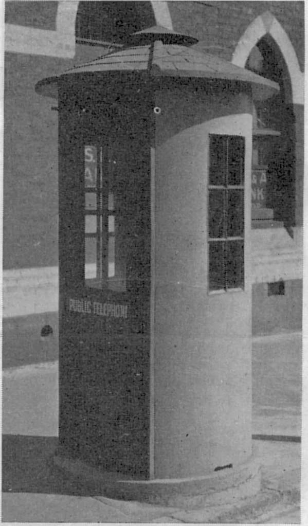 | Another innovation adopted in 1927 (Fig.7) was the precast ‘Pipe Type’ concrete cabinet with wooden door and concrete floor. The cabinet itself was in fact made from cylindrical precast pipe with two small half length windows. These cabinets featured precast concrete roofs, some of which were flat with small conical metal ventilators in the centre, whilst others were conical and ornamented to represent small roofing tiles. Source- (with thanks to) History of the telephone in New South Wales / by Jim Bateman [Croydon, N.S.W.] : J. Bateman, 1980 ISBN: 0959478701 |