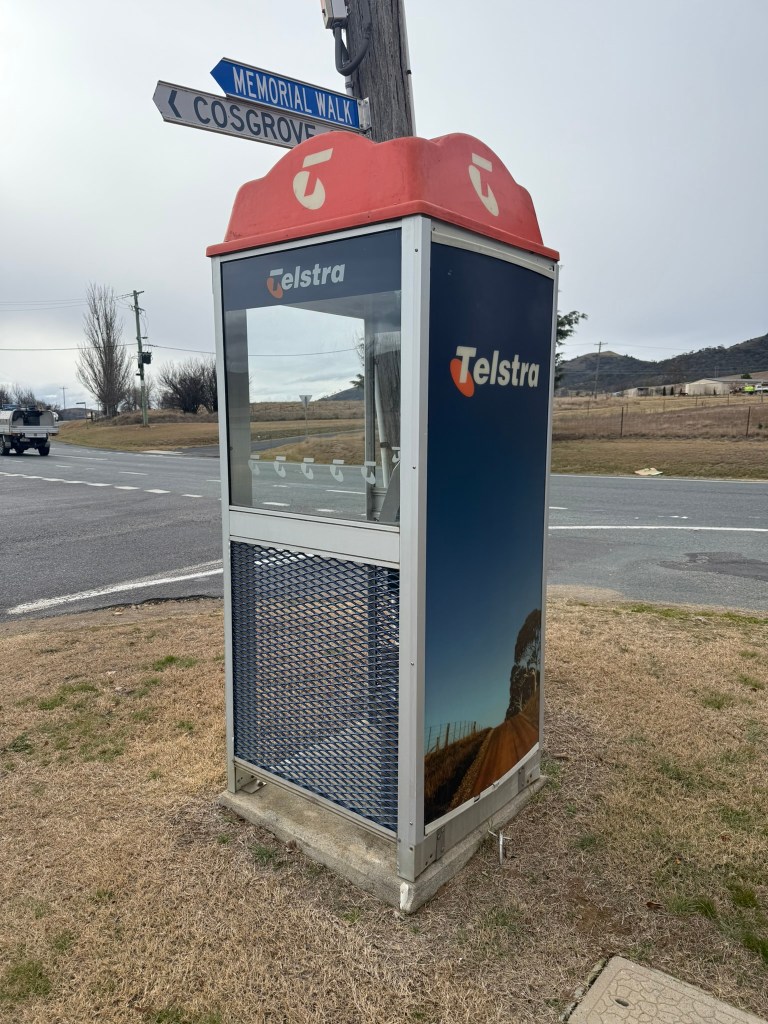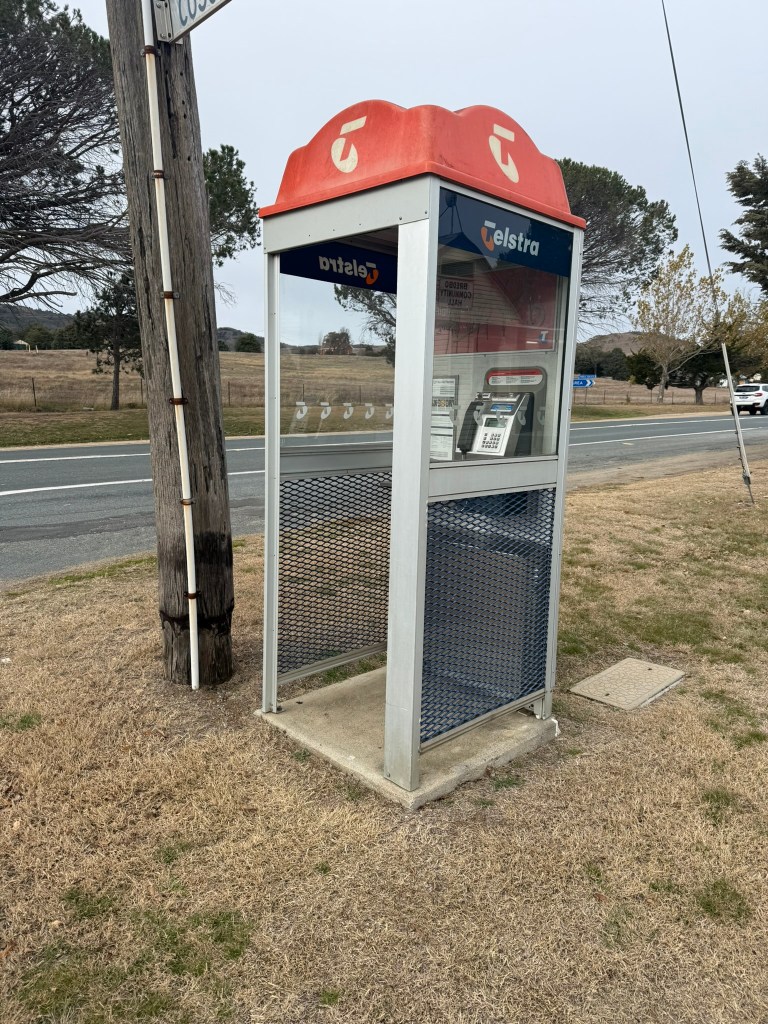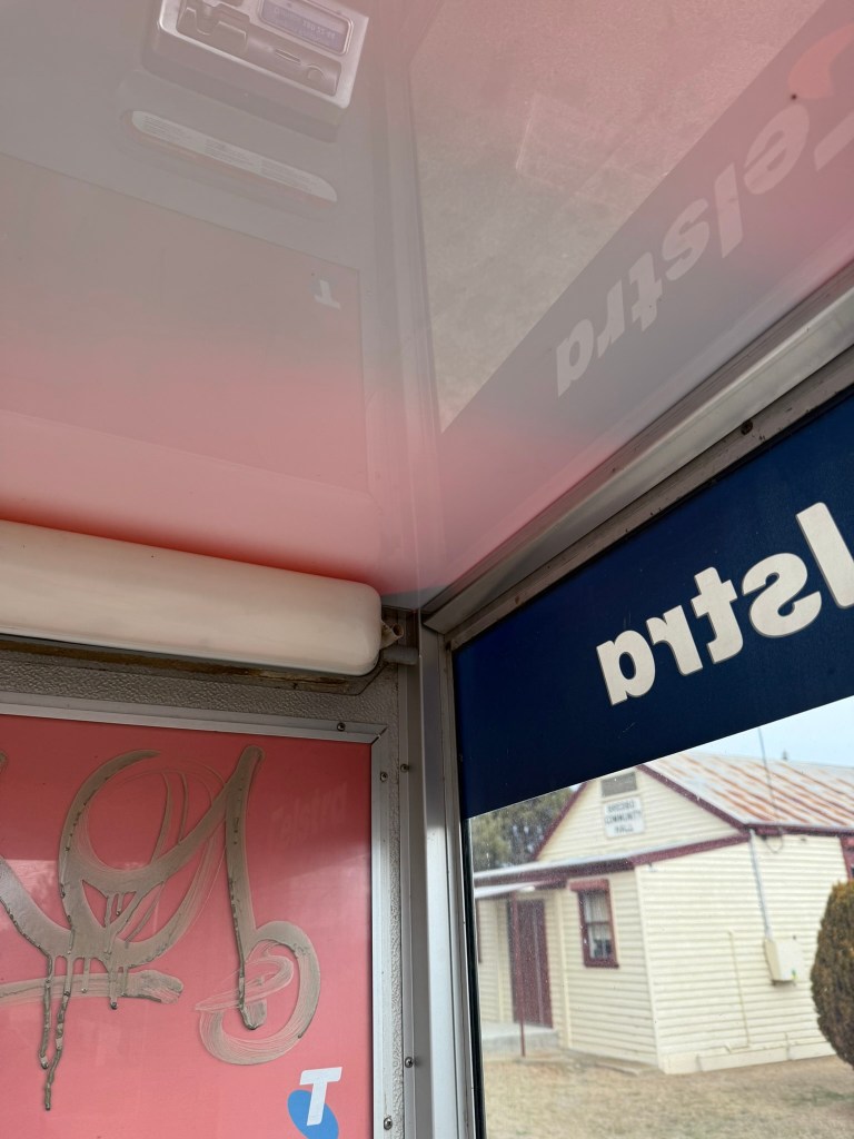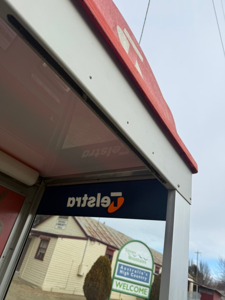 Below gallery- an adapted/modernised old flat roof booth. Door removed, roof replaced, advertising panel mounted on back. Phone and backpanel updated with new phone etc. Photographed in Bredbo NSW 15.06.25.