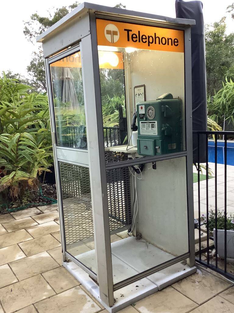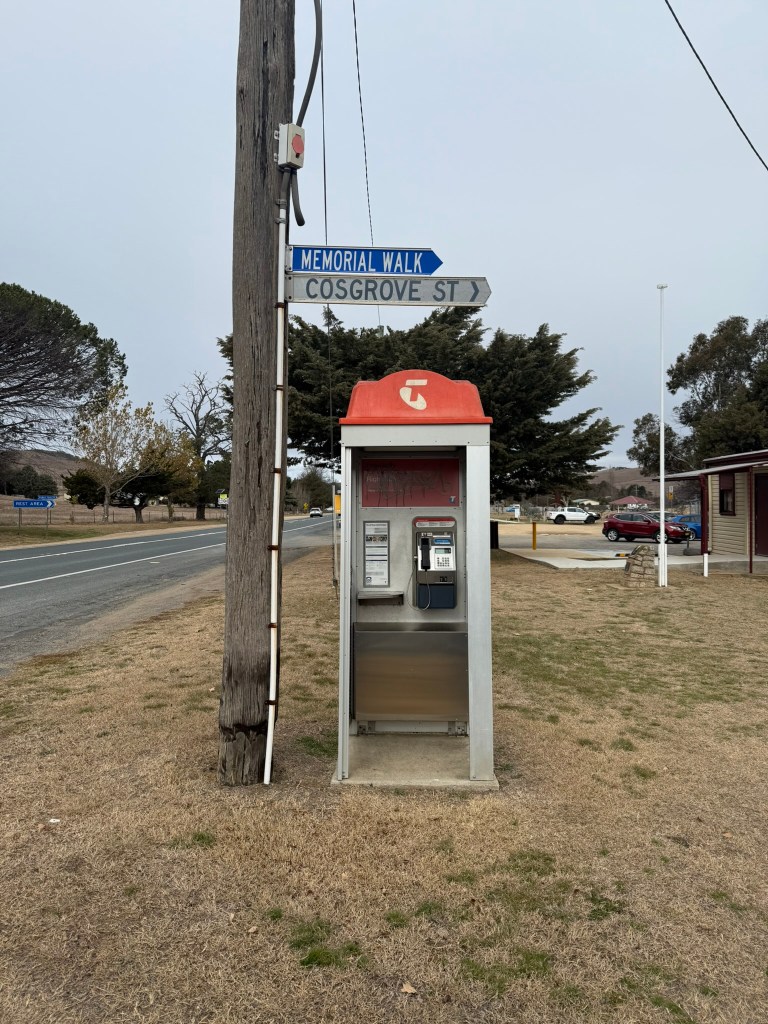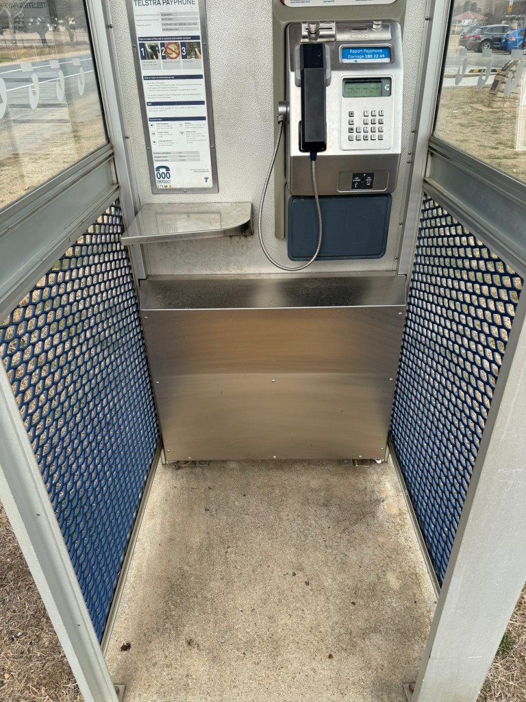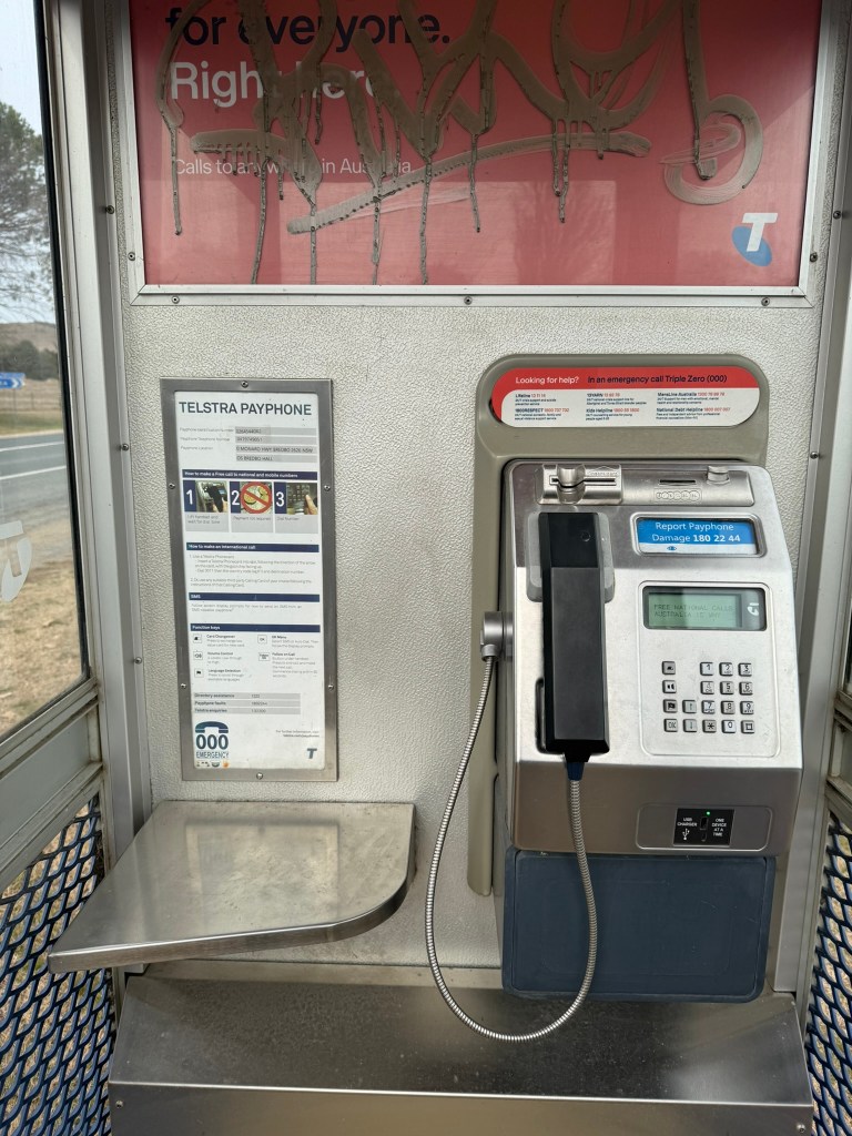 Below gallery- an adapted/modernised old flat roof booth. Door removed, roof replaced, advertising panel mounted on back. Phone and backpanel updated with new phone etc. Photographed in Bredbo NSW 15.06.25.