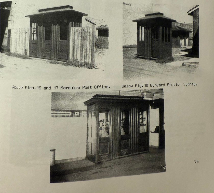 | The use of multiple or banks of cabinets is still popular in heavy usage locations. Below Figs.14 and 15 at Central Railway (cabinets now demolished), -Post Office location at Maroubra Figs.16 and 17 (now gone) and Wynyard Railway Station (underground Sydney) which still exist to-day without the two penny call fee of course. ![]() ![]() The basic forms were: a) Glazed half length two sides and door, b) Glazed full length two sides and door, c) Glazed half length all sides and door, d) Glazed full length all sides and door. Fig. 19 is an e·xample of d) while Fig.20 is an example of a). AS popular as these cabinets seem to have been with the public, they still possessed shortcomings, particularly in ventilation and maintenance, but it is sad to think they will have completely disappeared from our streets by the early 1980’s. Source- (with thanks to) History of the telephone in New South Wales / by Jim Bateman [Croydon, N.S.W.] : J. Bateman, 1980 ISBN: 0959478701 Below- multiple newly refurbished bank at Martin Place railway station, Sydney. 2025 ![]() |