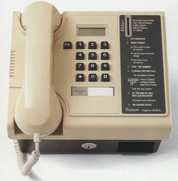| CT 23 – Coin Telephone No. 23 (“Payphone 100”) Also known as the Payphone 100 Mark I/II Features include LED credit display, star/# key variants, and compact plastic body with moderate security—designed for supervised indoor use. Wall-mounted or chained into place, weighing ~3 kg The instrument has been styled to harmonise with the New Generation Telephones incorporating a keypad and a new styled handset. Due to the styling the payphone does not have a high degree of security and therefore the installation should be in a well supervised location. It will be possible to screw the CT23B down to a shelf or to chain it by a clasp fixing at the rear of the cash compartment. |
