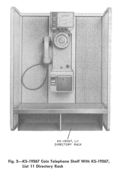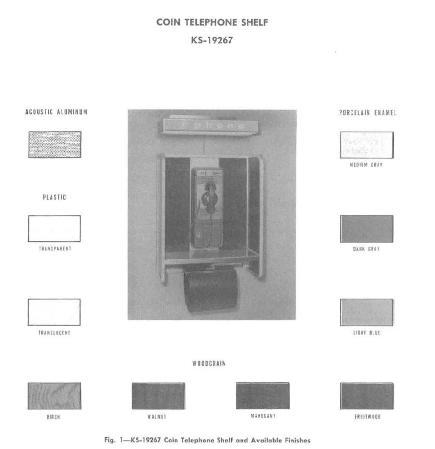 | KS-19267 Coin Telephone Shelf – Overview The KS-19267 is a coin telephone shelf designed for indoor use, specified under Bell System Practices, specifically Section 508-121-100, Issue 3, dated September 1965 It falls under the category “Shelves – Indoor – 19 and 20-type” and serves as a mounting surface for coin telephone sets and accessories The KS-19322 sign (List 1) can be mounted just above the shelf for illumination or signage purposes; moreover, if cords pass behind the shelf, a KS-19322 List 16 wire shield kit is used to cover exposed wiring. Compatibility The KS-19267 shelf was designed to support coin telephone sets such as the 1E-type models—these could be mounted on the shelf or within booths using it It was part of a broader ecosystem that included various booth types like: KS-16797 Universal Booth KS-19206 Curved-Door Booth KS-19340 Wood Booth KS-19425 Indoor-Outdoor Booth All of these could utilize the KS-19267 shelf for mounting or counter surfaces |