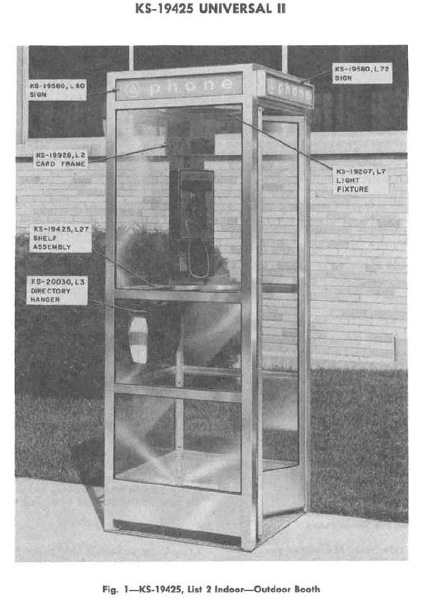 | Overview & Date of Introduction The KS-19425, also known as the Universal II Booth, is an aluminum-and-glass enclosure designed to replace the earlier KS-16797 model. It is suitable for single, side-by-side, or back-to-back installations, offering flexibility in placement and configuration. Documented in Bell System Practices (BSP), the 509-232-100 Installation Manual (Issue 2, December 1969) provides the official identification and installation details of the KS-19425, indicating its introduction around that time. A separate Maintenance Manual (Section 508-232-300, Issue 3, November 1968) also references the KS-19425, reinforcing that it was designed and in circulation by late 1968. The timeline thus suggests that introduction began in 1968, with formal installation standards established by December 1969. User Configuration: Primarily designed for stand-up service, but also supports a high-position seat approximately 27 inches from the floor for sit-down use, if desired ManualsLib . Door Design: Features a self-closing door made of two vertical sections with safety glass panels. The door folds inward along the right wall and can remain partially open when installed indoors. It incorporates rubber molding on the bottom edge for safety, while spring mechanisms hold the door at a partially open position when released. Lighting & Ventilation: Interior illumination is handled by the KS-19207, List 7 light fixture unit, which lights signage on the booth’s front, sides, and rear. For outdoor installations, a KS-19261, List 1 light control unit may be used. This photocell-controlled device automatically turns lights off during daylight and on during evening hours. In multi-unit rows, up to five booths can share a single control if mounted at the end of the row. Electrical Configuration: Boasting versatile hookups, the booth supports List 26 and List 27 shelf assemblies, a List 3 directory hanger, and a List 25 lower backboard plate/cover assembly. Auxiliary power and control wiring include List 22 cable assemblies to bring power in, plus provisions for interconnecting multiple booths and integrating with circuit breaker boxes. Manufacturer Details Branding & Fabrication: Although the booth was distributed by Western Electric for use throughout the Bell System, specific documentation does not clearly identify the actual fabricator of the KS-19425. Historically, similar aluminum Booth models (e.g., KS-16797, KS-19206) were manufactured by Aluminum Company of America (Alcoa) at their New Kensington, PA plant. It is reasonable to infer that Alcoa—or a similar contractor—likely produced the KS-19425 as well, given the consistent materials, design lineage, and distribution approach. |