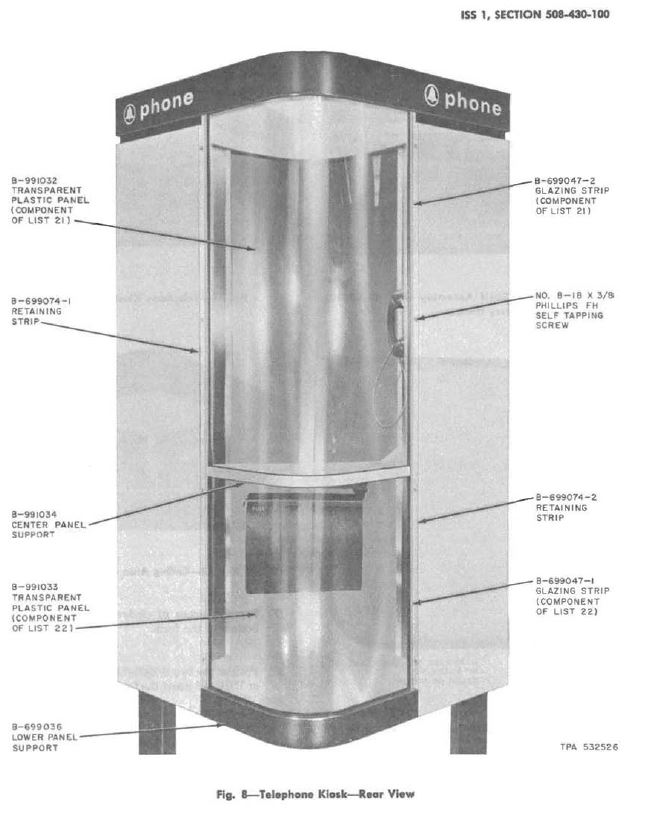 | Overview & Functionality The KS-20255, also referred to as the Telephone Kiosk (Diamond Kiosk), is a stand-up, outdoor, doorless telephone booth featuring a distinctive diamond-shaped design. It was primarily intended for placement on city sidewalks, mall concourses, cultural centers, or other open public spaces. Its elevated lower section allowed debris and rain to pass beneath, enhancing cleanliness and safety. Though not designed for continuous rows, multiple kiosks could be arranged together in aesthetically pleasing layouts. Optional directory facilities could also be installed. Documentation & Timeline The KS-20255 is documented in Bell System Practices (BSP) under Section 508-430-100, Issue 1, dated December 1976, covering identification, installation, and maintenance guidelines. telephonecollectors.info The Coin Service Manual (Issue 3, December 1972) also includes KS-20255 in its table of contents under “Telephone Kiosk (Diamond Kiosk)”. These references suggest that the KS-20255 was standardized and in use from at least the mid-1970s. Features & Design Highlights Design: Doorless, diamond-shaped outdoor kiosk, ideal for open public areas. Functionality: Raised lower section to prevent debris accumulation and enhance ventilation. Customization: Optional directory units available to assist users. Installation Details: According to a co-located coin telephone installation manual, the backboard furnished with the kiosk must be used, and specific security hardware (P-40Y061 studs and ¼-20 × 5/8″ RHM screws) are required for installation. |