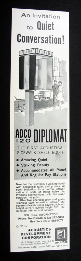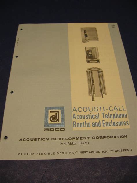 | Here’s a deep dive into Adco phone booths—though it’s important to clarify: this refers to ADCO (“Acoustics Development Corporation”), not to be confused with other companies using similar acronyms. That image is from a vintage ADCO Brochure (circa late 1970s–early 1980s), titled Acousti-Call Acoustical Telephone Booths and Enclosures, produced by Acoustics Development Corporation, based in Park Ridge, Illinois. The brochure highlights their acoustically engineered booths for public settings. Who was ADCO? ADCO stood for Acoustics Development Corporation—a company specializing in metal telephone booths, enclosures, directory signs, and shelves, all designed with acoustic performance in mind They held a trademark for “ADCO ENCLOSURES”—defined specifically to cover metal telephone booths, public equipment kiosks, and ATM booths The brand name “A ADCO” was filed in 1962 and registered to Acoustics Development Corporation, describing acoustical telephone booths and panels What Did They Make? Beyond catalog images, several sources mention product types: An ADCO Model 120 booth was listed for sale, measuring approximately 32″ × 27″ × 85″ and weighing around 205 lb, giving us a practical size reference ADCO collaboratively provided replacement enclosures—like Myrmidon’s MC-101—as modern equivalents for ADCO’s Model 10S and Model 16 booth types There are also vintage ADCO-branded illuminated signs (e.g., for Ohio Bell) used with phone booths, showcasing their branding and aesthetic style In Summary ADCO (Acoustics Development Corporation) produced durable, acoustically designed metal phone booth enclosures throughout the 1960s–1980s. Their offerings included complete booth units, signage, and accessories. Today, their booths survive in surplus listings and historical catalogs, with modern replacements like Myrmidon’s MC-101 designed to fill the gap left by |
